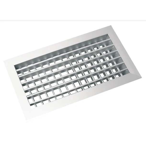 Kétsoros alumínium fali rács elszívásra vagy befúvásra, állítható lamellákkal a légáram irányításához. Rejtett rögzítéssel, külön rendelhető beépítő kerettel és/vagy légmennyiség szabályzó zsaluval, fehér (RAL9016) színre festett alumíniumból.