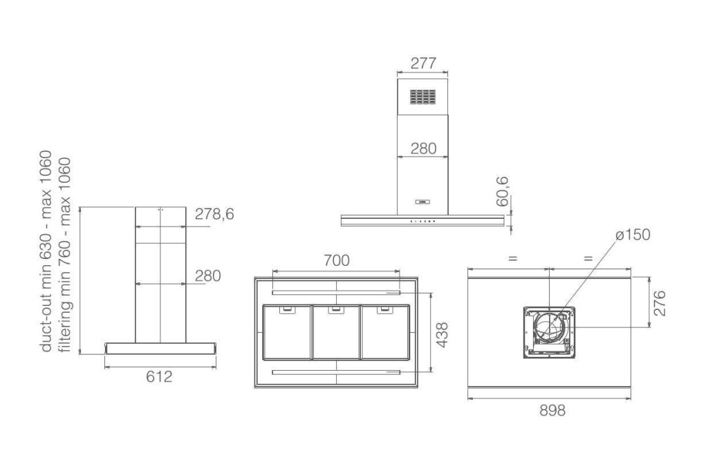 A fekete üveg előlap alumíniumkeretbe van foglalva, ami kiemeli a készülék vonalait. A páraelszívó továbbá távvezérelhető: alkalmazással vagy hangvezérléssel bluetooth kapcsolattal és az épp használatban lévő Elica főzőlapok teljesítményének megfelelően állítja be magát. Maximális sebességnél 770 m³/h kapacitással kiváló teljesítményű szívórendszerrel rendelkezik. Az érintésvezérlőt az üveg elrejti, a LED-ek alacsony energiafogyasztással világítják meg a főzőlapot.