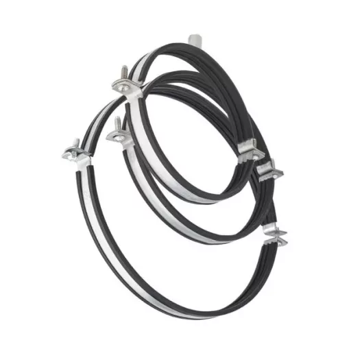 Horganyzott acél csőbilincs gumi tömítéssel, kör keresztmetszetű légcsatorna függesztésére. NA80 és NA400 mm méretek között a fél darabok a két oldalon M6-os csavarral, NA450 méret a fél darabok a két oldalon M10x25-os csavarral összefogva, valamint egy függesztő pont a bilincs tetején M8/M10 furattal. A maximális teherbírás: 500 kg.
