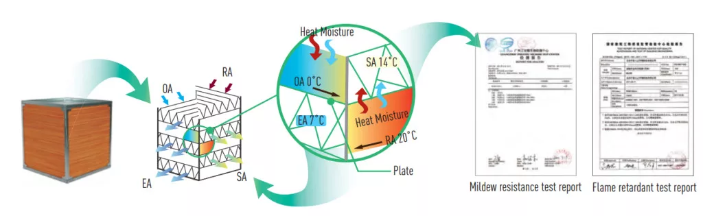 A 3. generációs keresztáramú entalpia-cserélő a legújabb nanofiberszerkezetből készül, hogy nagyobb hatékonyságot biztosítson. A hőcserélő anyaga penészálló és tűzgátló. Könnyen hozzáférhető, porszívóval egyszerűen tisztítható.