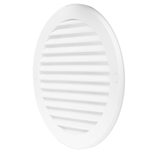 Fehér PVC szellőzőrács karimával, műanyag rovarvédő ráccsal alkalmas szívó és fúvó szellőztetés végzáró elemének. Fix döntött zsaluval.